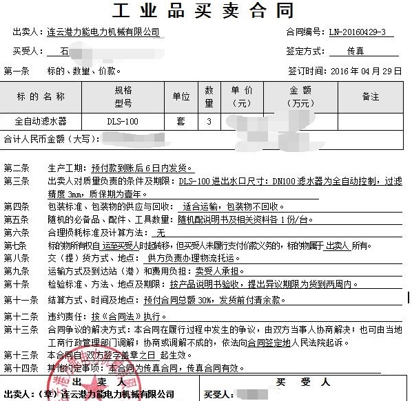 石女士購買全自動濾水器DLS-100三套,感謝石女士對本公司的信賴!本公司將全力為顧客服務,做一個讓客戶滿意的全自動濾水器專業生產廠家。下面為簽訂的購買合同以及產品照片。