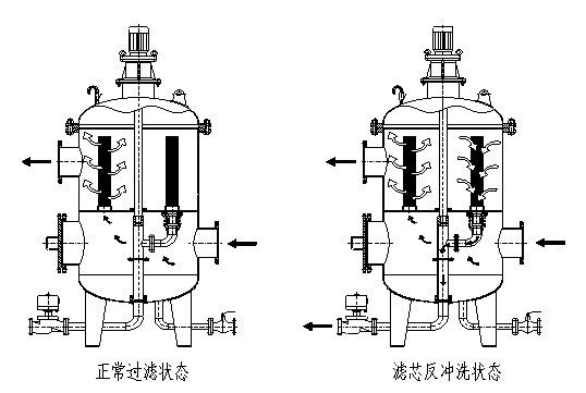 正常過濾狀態:排污口閥門關閉。取自自然的江水、河水由濾水器上腔進水口進入,水中的塑料泡沫、樹枝、水草以及直徑大于隔板欄污柵孔徑的顆粒留在濾水器上腔,并由上排污閥排出。較為清潔的水經導流管流至下腔,水到下腔后,一些沙�?沙恋降装宄辽呈覂�,沙�?捎蓻_排泥沙出口排出。下腔的水從下隔板的孔流入V形楔式不銹鋼過濾網管,過濾后的清潔水從濾水器中間的出水口流出。